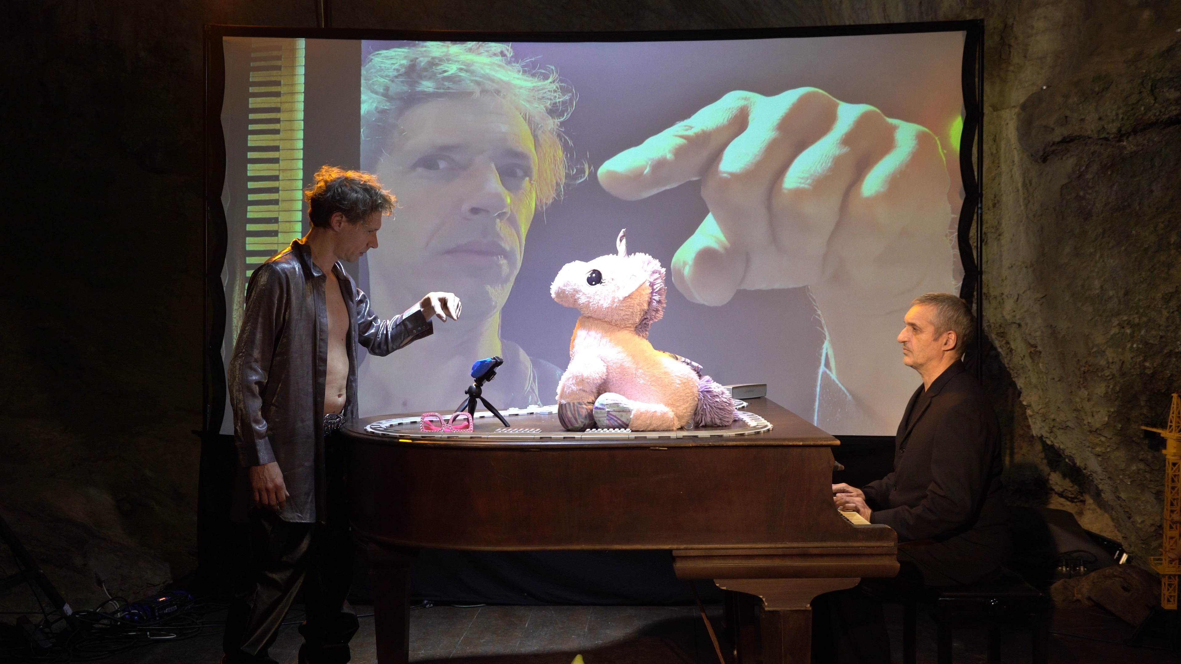 Forty-six years after its creation, “The Wall” resonates with a haunting intensity, as Roger Waters denounced the walls of alienation: school, war, fame… In 2025, we are living in an era of new walls: algorithmic bubbles, addictive screens, social media, generative AI. This performance strips the cathedral-like work of its rock arsenal to reveal its heart-wrenching intimacy. A piano, a voice, children’s toys filmed live on a smartphone and projected on a monumental scale. The piano lid becomes a miniature children’s room where Pink’s inner drama unfolds… The smartphone, a poetic tool for capturing moments, gradually reveals its true nature: an invisible wall between us and real life. From empty video conferences to compulsive doomscrolling, from deepfakes of tech oligarchs to dehumanizing memes, Pink navigates contemporary digital hell. Until the radical gesture: a single word—STOP. The screen goes dark… The show continues without digital support. Just the piano, the voice, the objects. Reality reclaims its place. The wall falls.