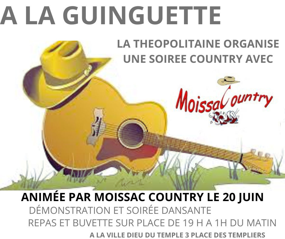 LA GUINGUETTE DE L’ETE organized by LA THEOPOLITAINE Friday SBK hosted by JOACHIM ET CHARLENE Saturday COUNTRY evening hosted by MOISSAC COUNTRY Free entry Meals and refreshments on site.