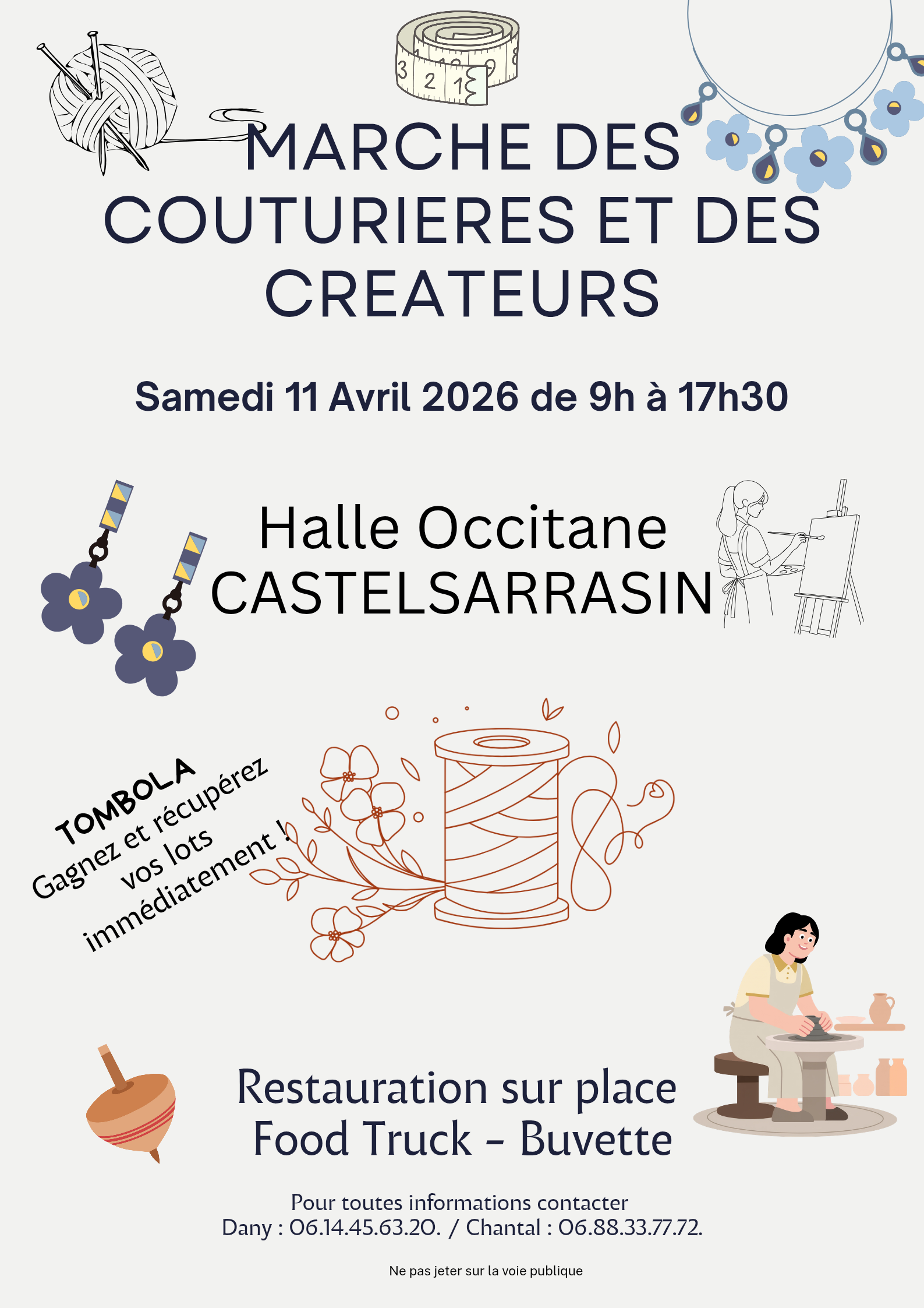 Puces des couturières and arts du fil: fabrics, haberdashery and unique creations await you. You’ll also find a wide range of artisans and creators, including pottery makers, in a friendly atmosphere.On-site catering (foodtrucks, refreshments)