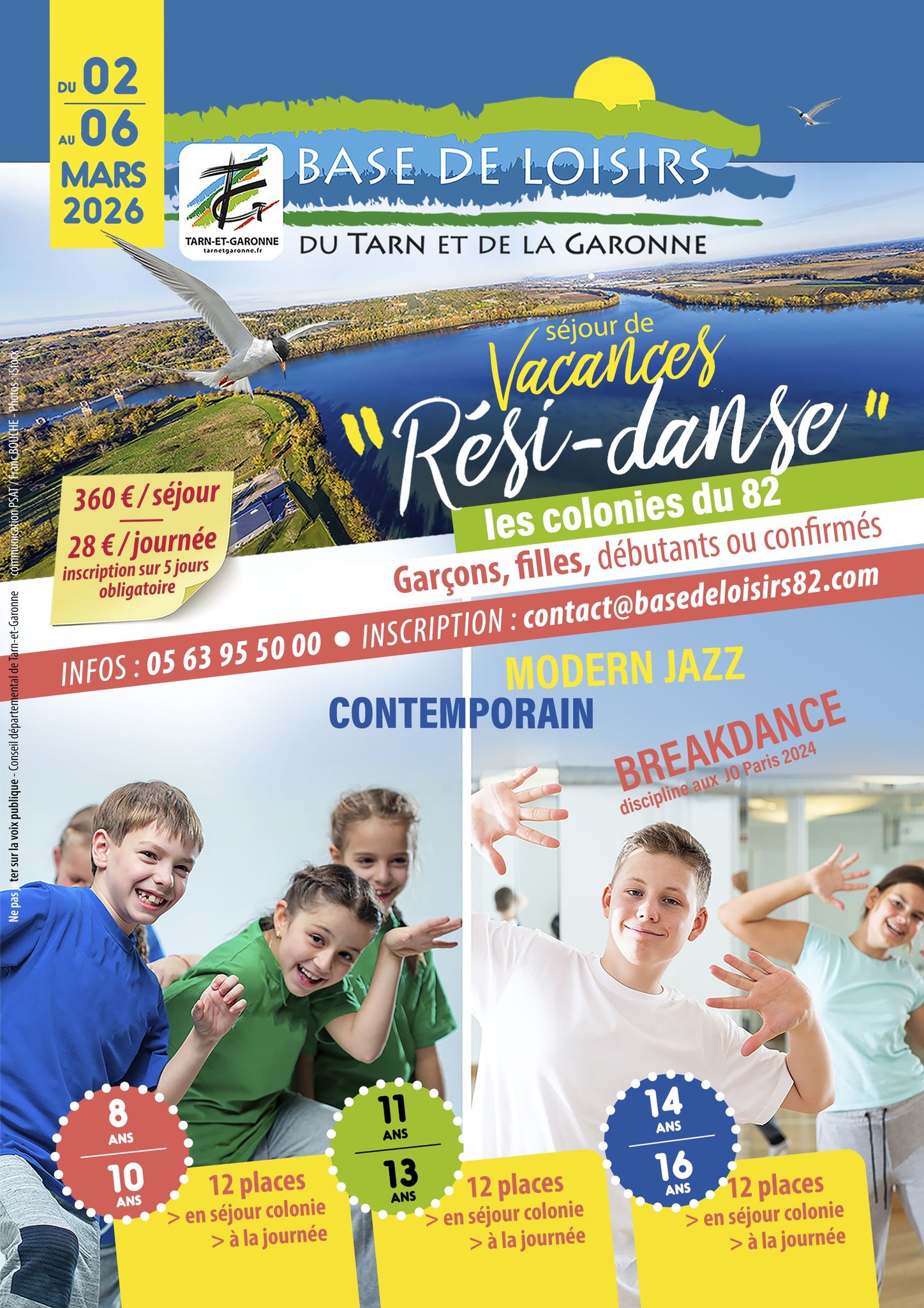 La colonie “Rési-danse” revient pour le plus grand plaisir des enfants et des jeunes de 8 à 16 ans à la Base de loisirs du Tarn et de la Garonne du 02 au 06 mars 2026 !