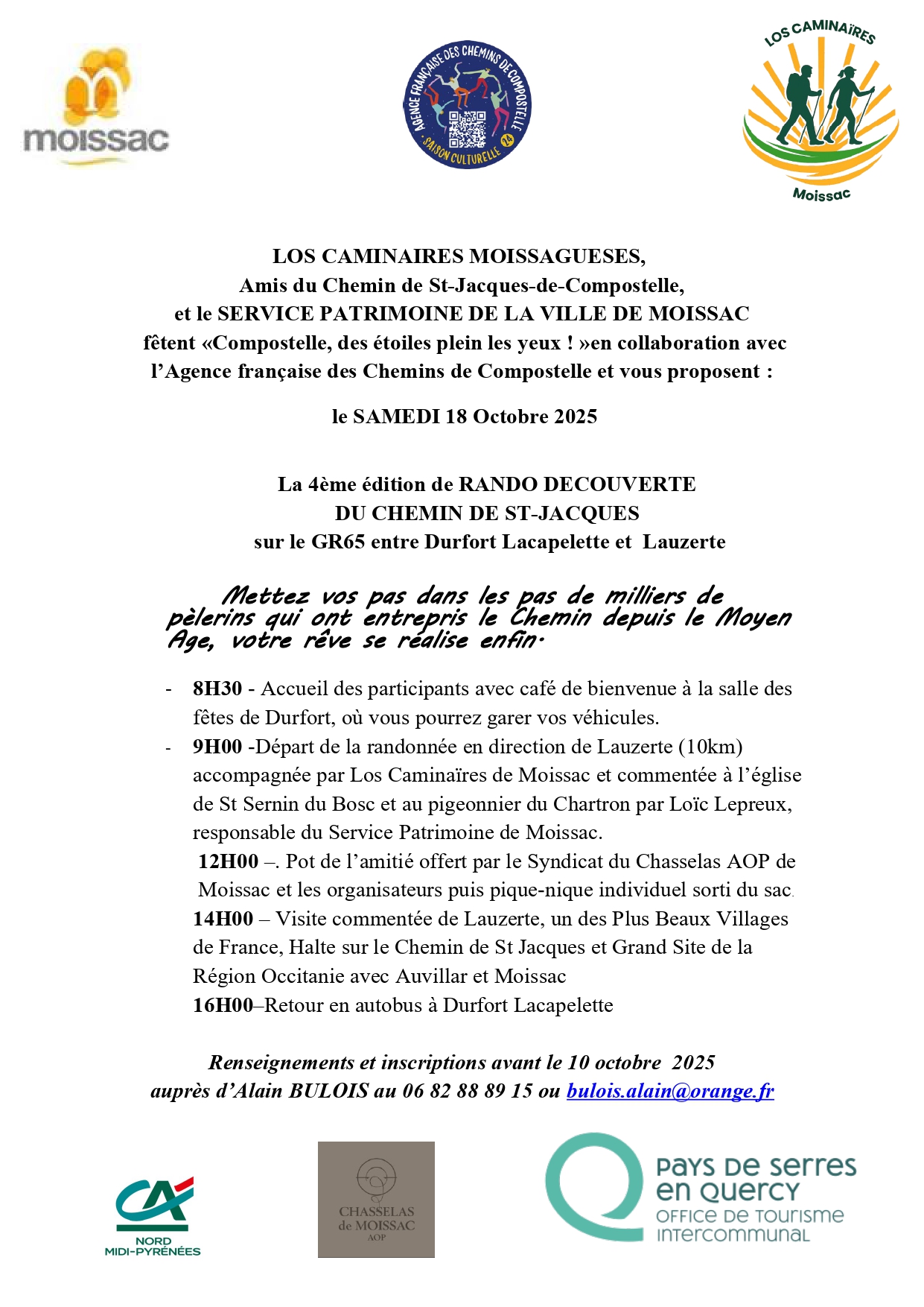 La 4ème édition de RANDO DECOUVERTE DU CHEMIN DE ST-JACQUES sur le GR65 entre Durfort Lacapelette et Lauzerte Mettez vos pas dans les pas de milliers de pèlerins qui ont entrepris le Chemin depuis le Moyen Age, votre rêve se réalise enfin.