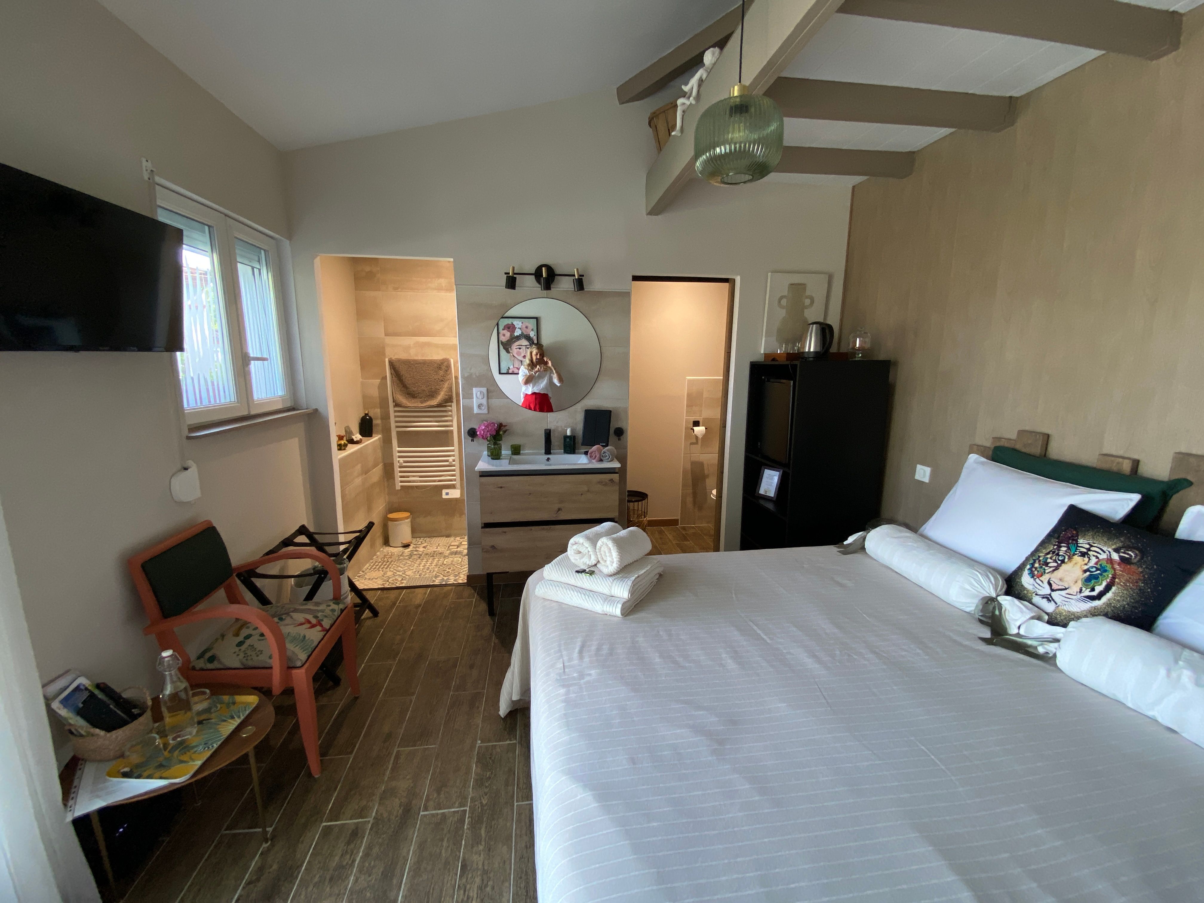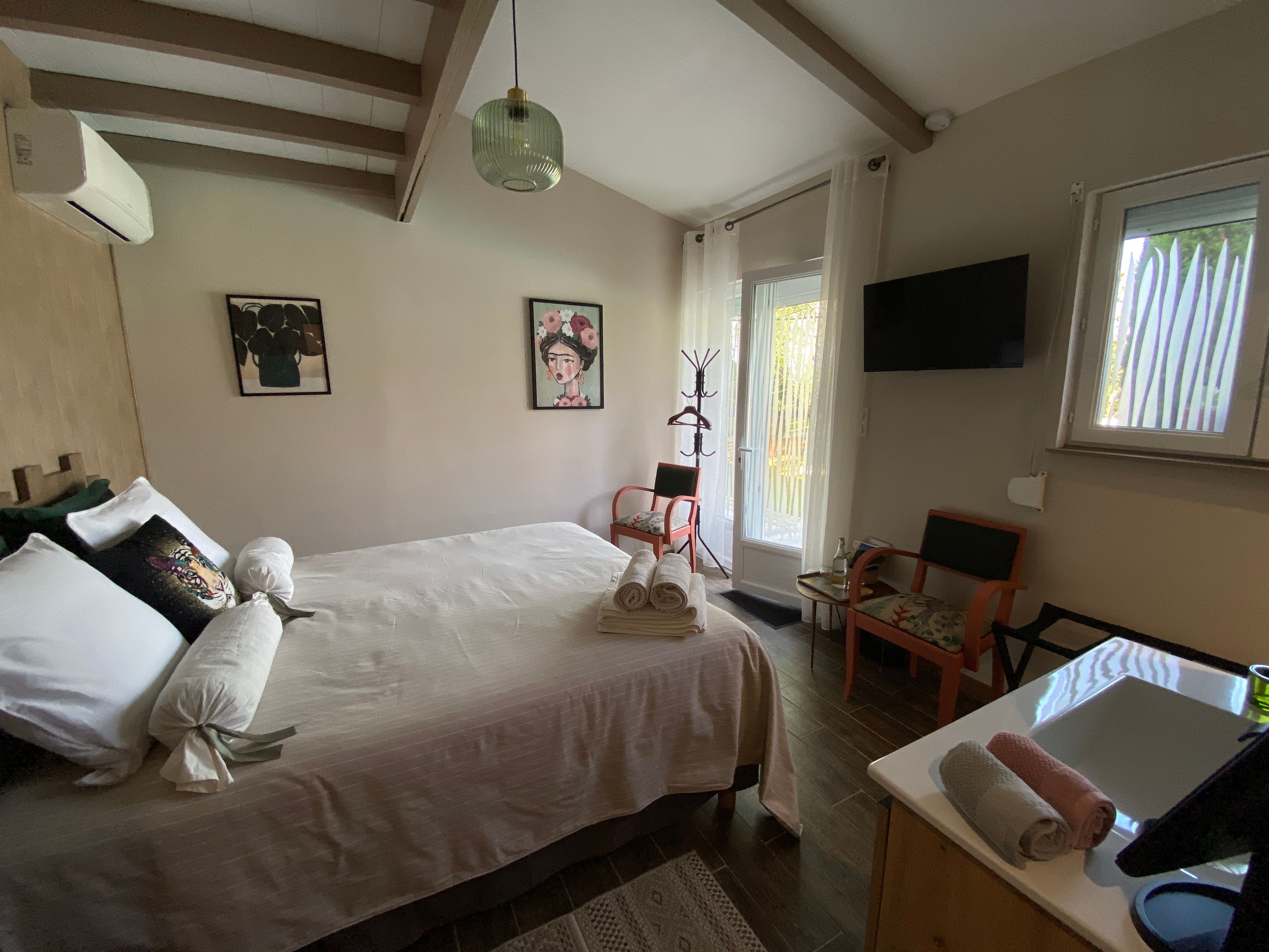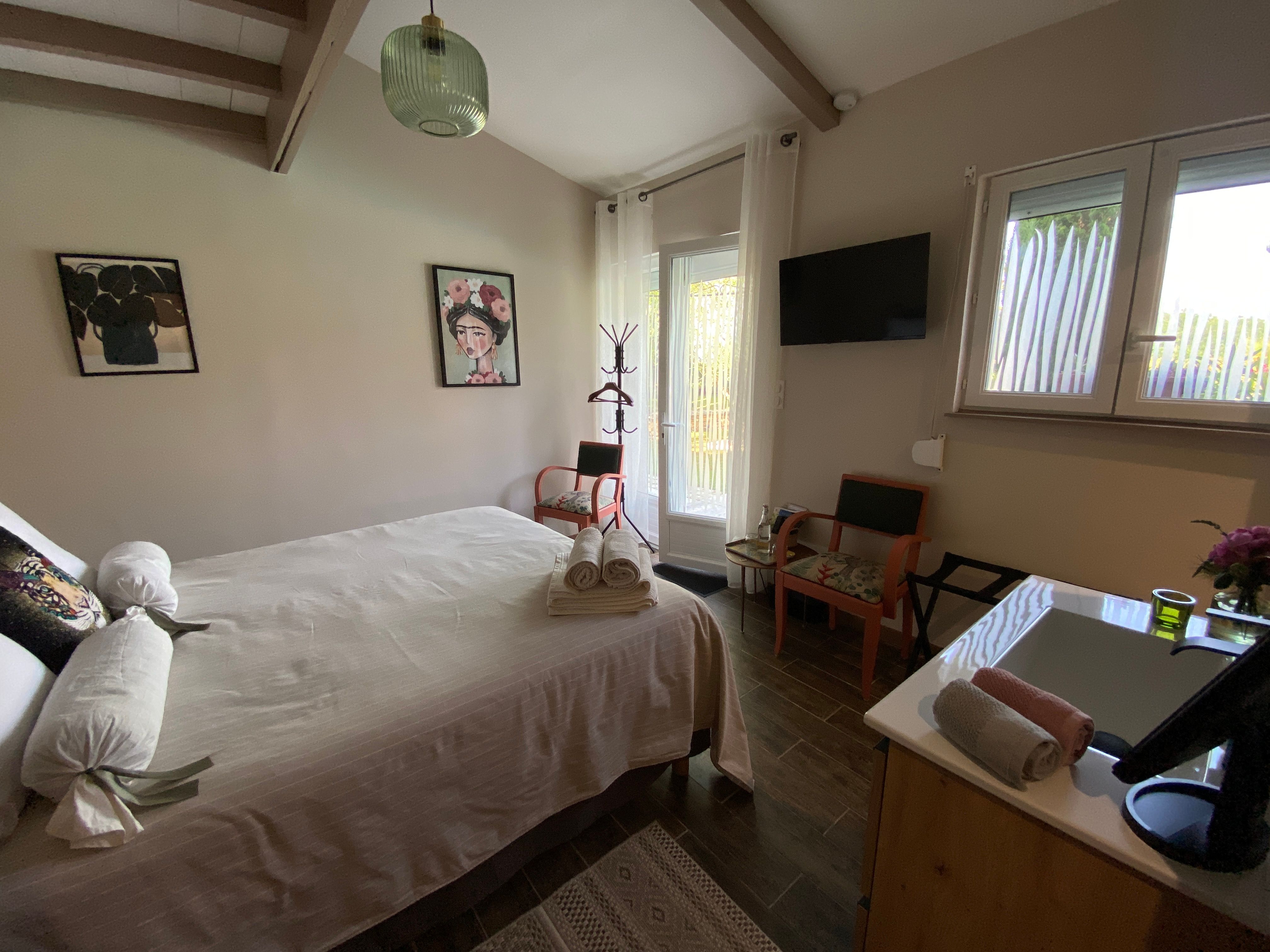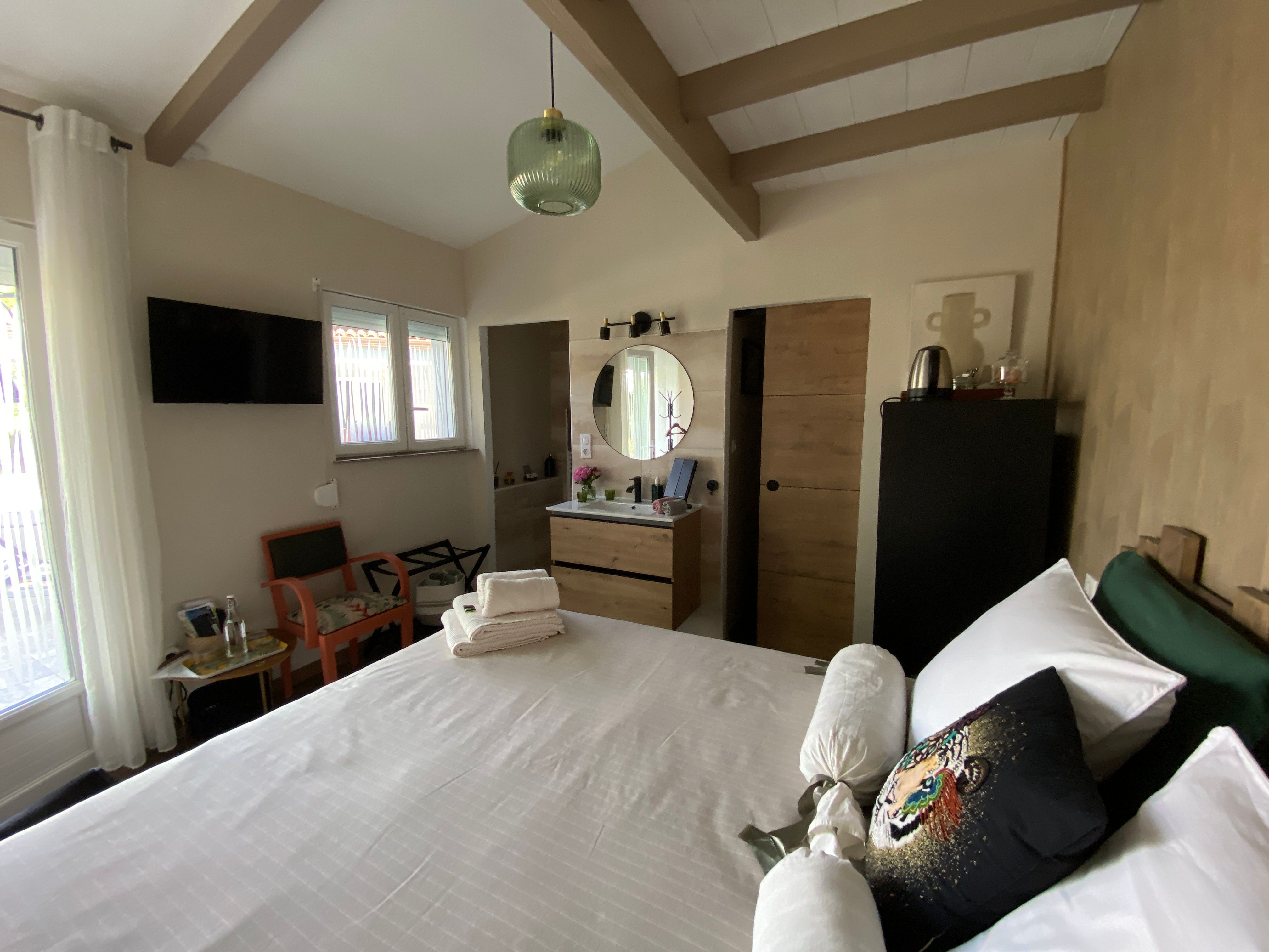 Dans une dépendance parfaitement aménagé la chambre d’hôtes vous attend avec 1 lit 160, une salle d’eau ouverte avec lavabo, douche (robinet thermostatique), wc séparés fermés. Fauteuils, plateau de courtoisie, télévision, wifi, climatisation. Espace extérieur protégé avec table chaises et le nécessaire pour pique-niquer (assiettes couverts verres) Tonnelle avec salon de jardin. Piscine chauffée à partager avec le propriétaire (transats). Jardin fleuri et clôturé.