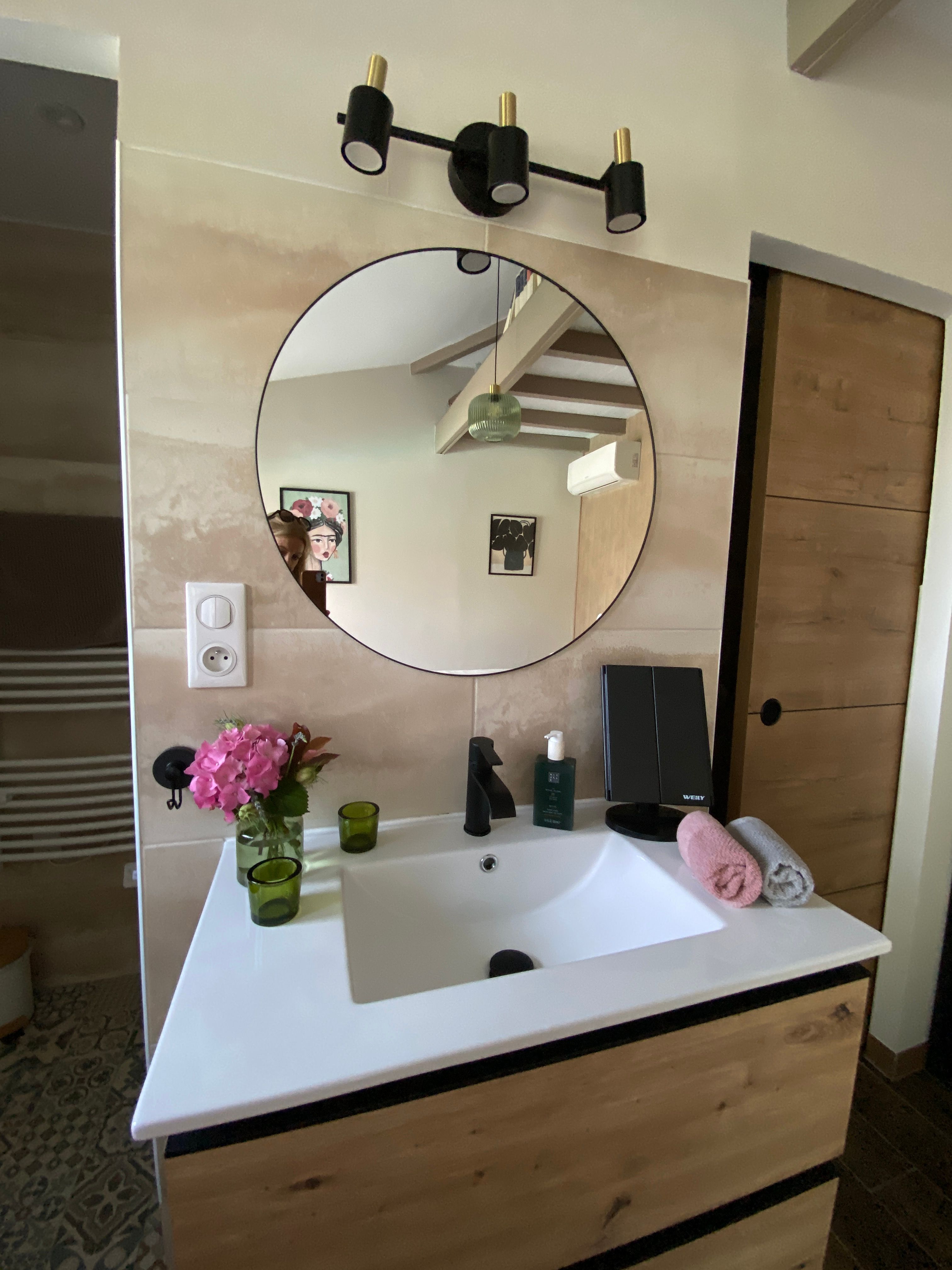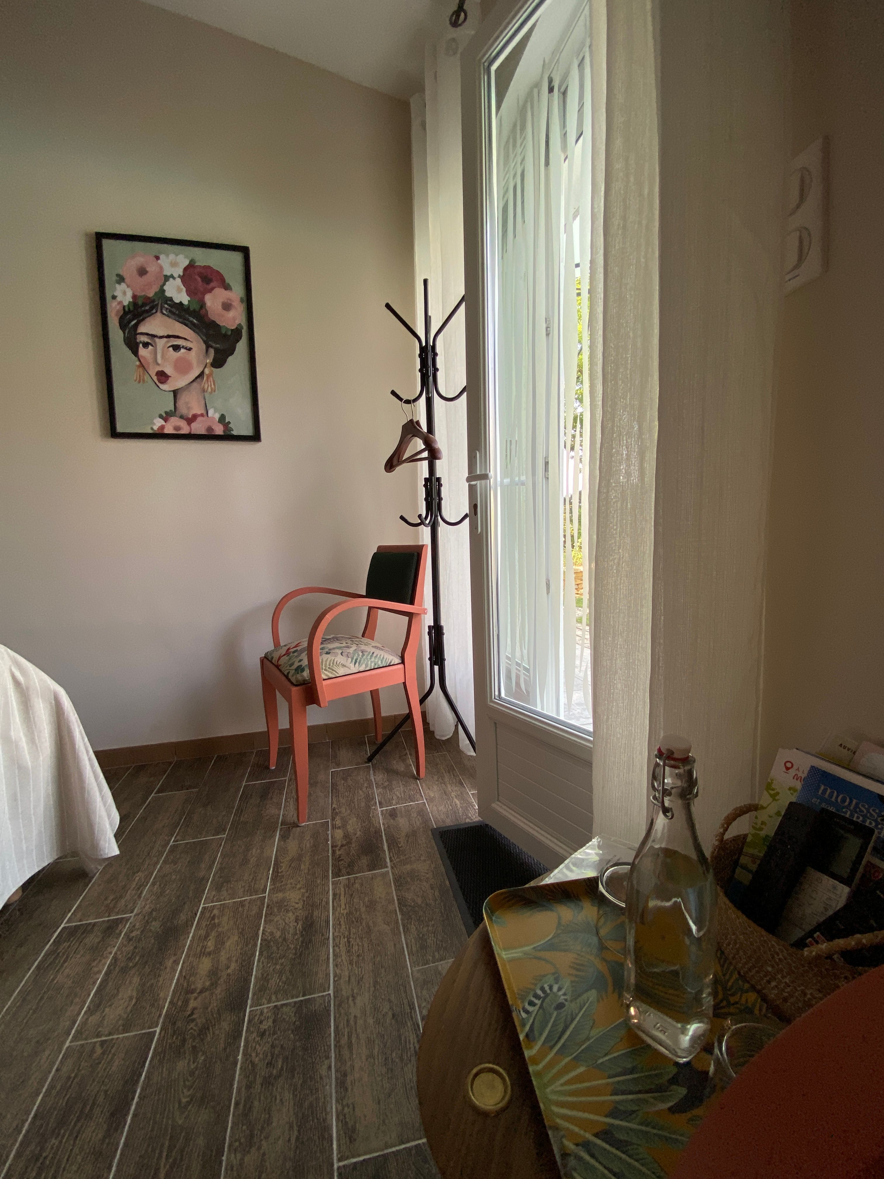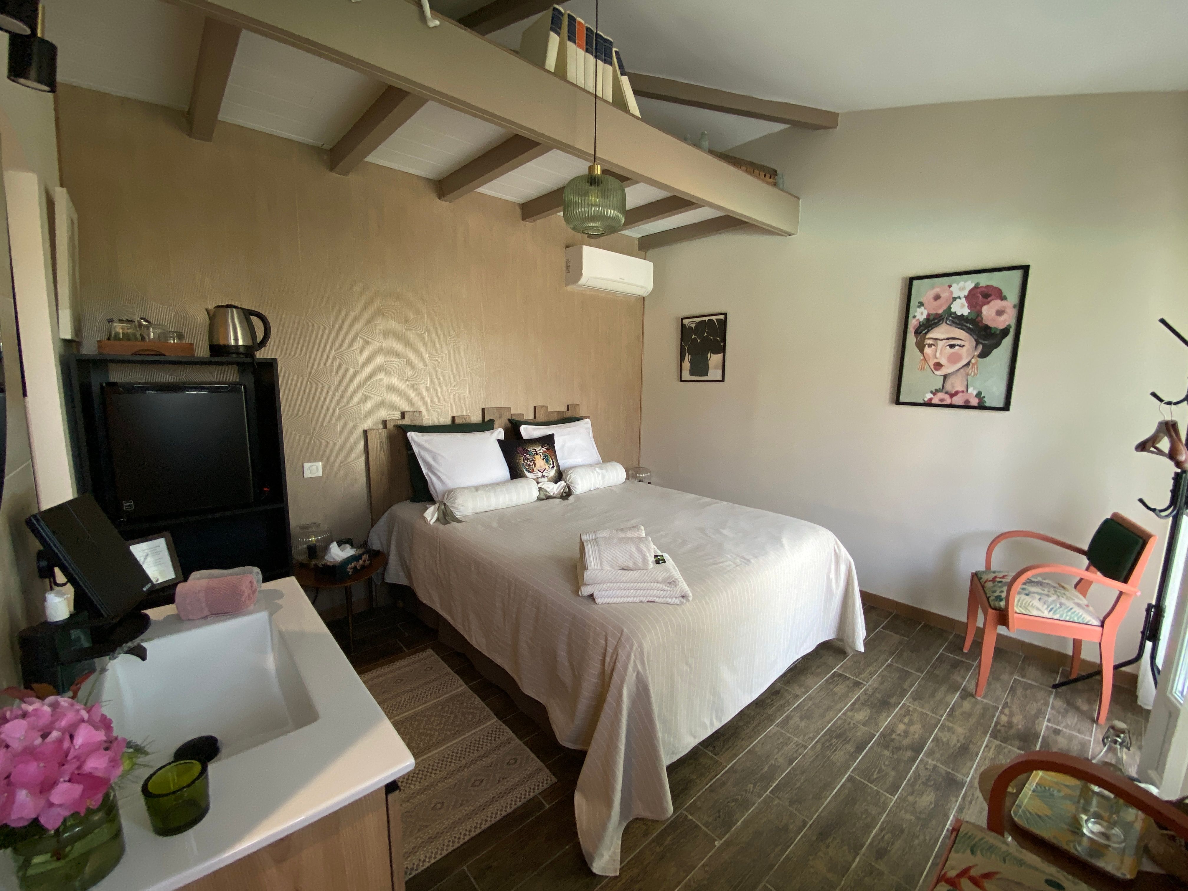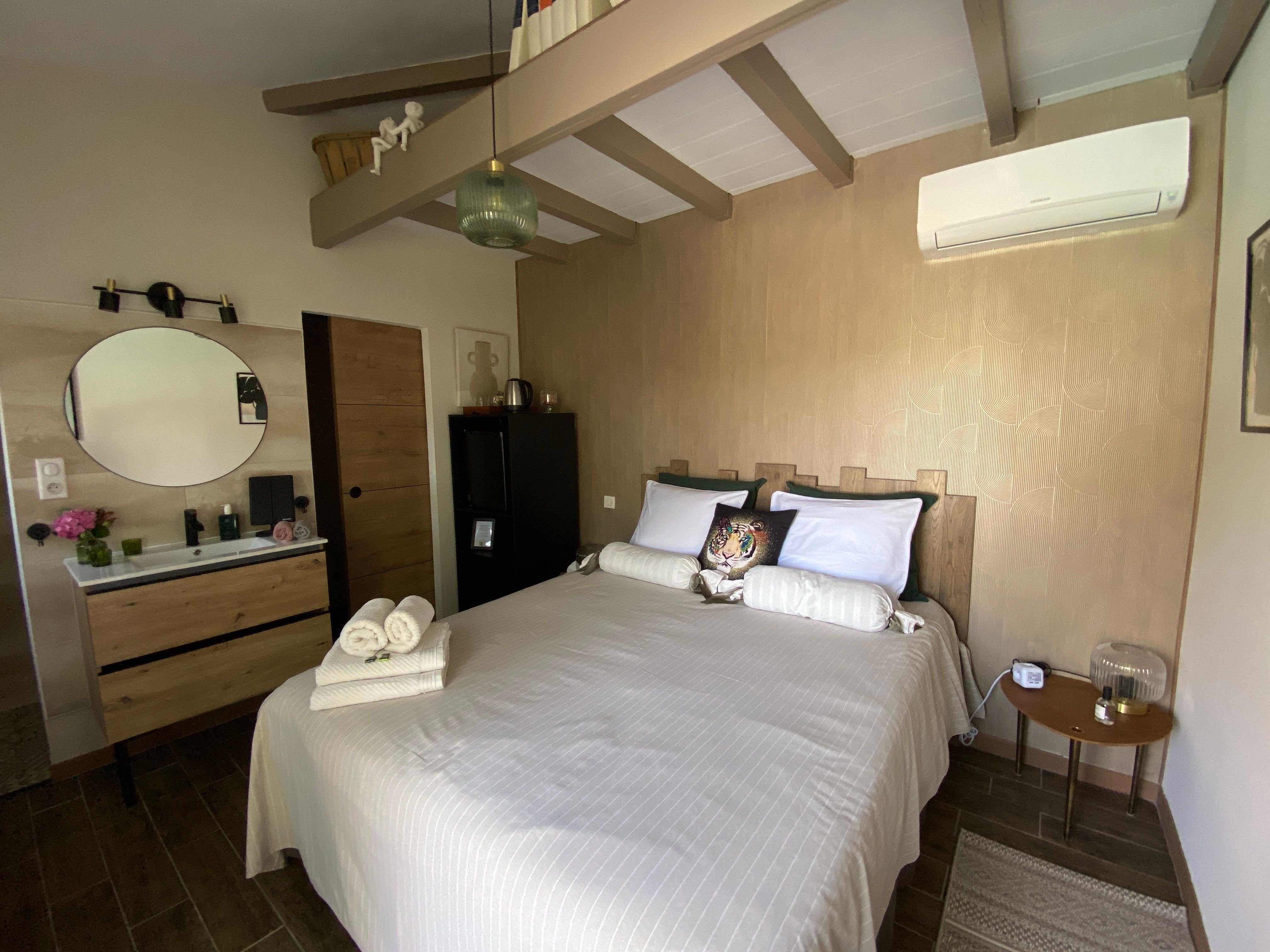 Dans une dépendance parfaitement aménagé la chambre d’hôtes vous attend avec 1 lit 160, une salle d’eau ouverte avec lavabo, douche (robinet thermostatique), wc séparés fermés. Fauteuils, plateau de courtoisie, télévision, wifi, climatisation. Espace extérieur protégé avec table chaises et le nécessaire pour pique-niquer (assiettes couverts verres) Tonnelle avec salon de jardin. Piscine chauffée à partager avec le propriétaire (transats). Jardin fleuri et clôturé.
