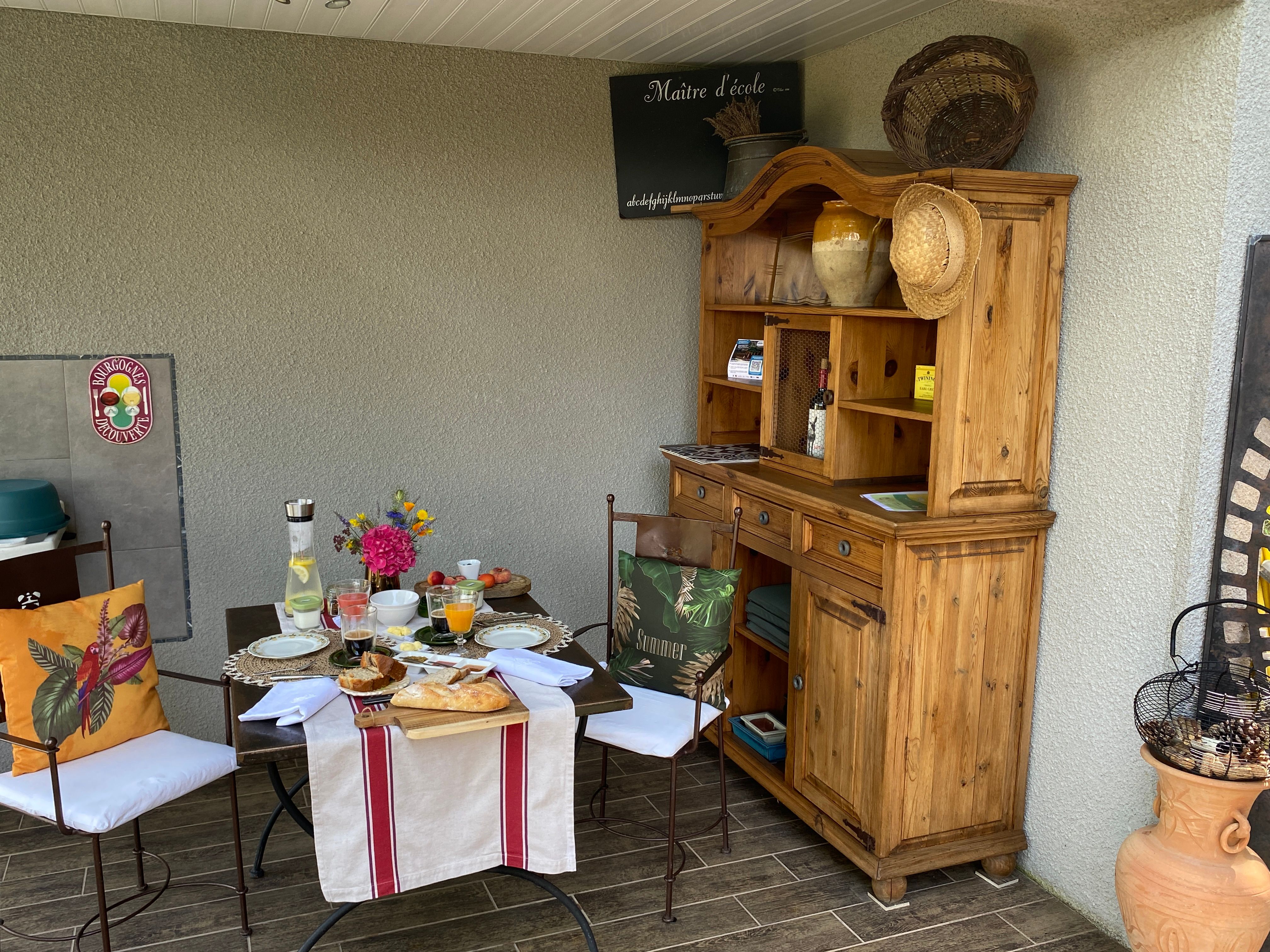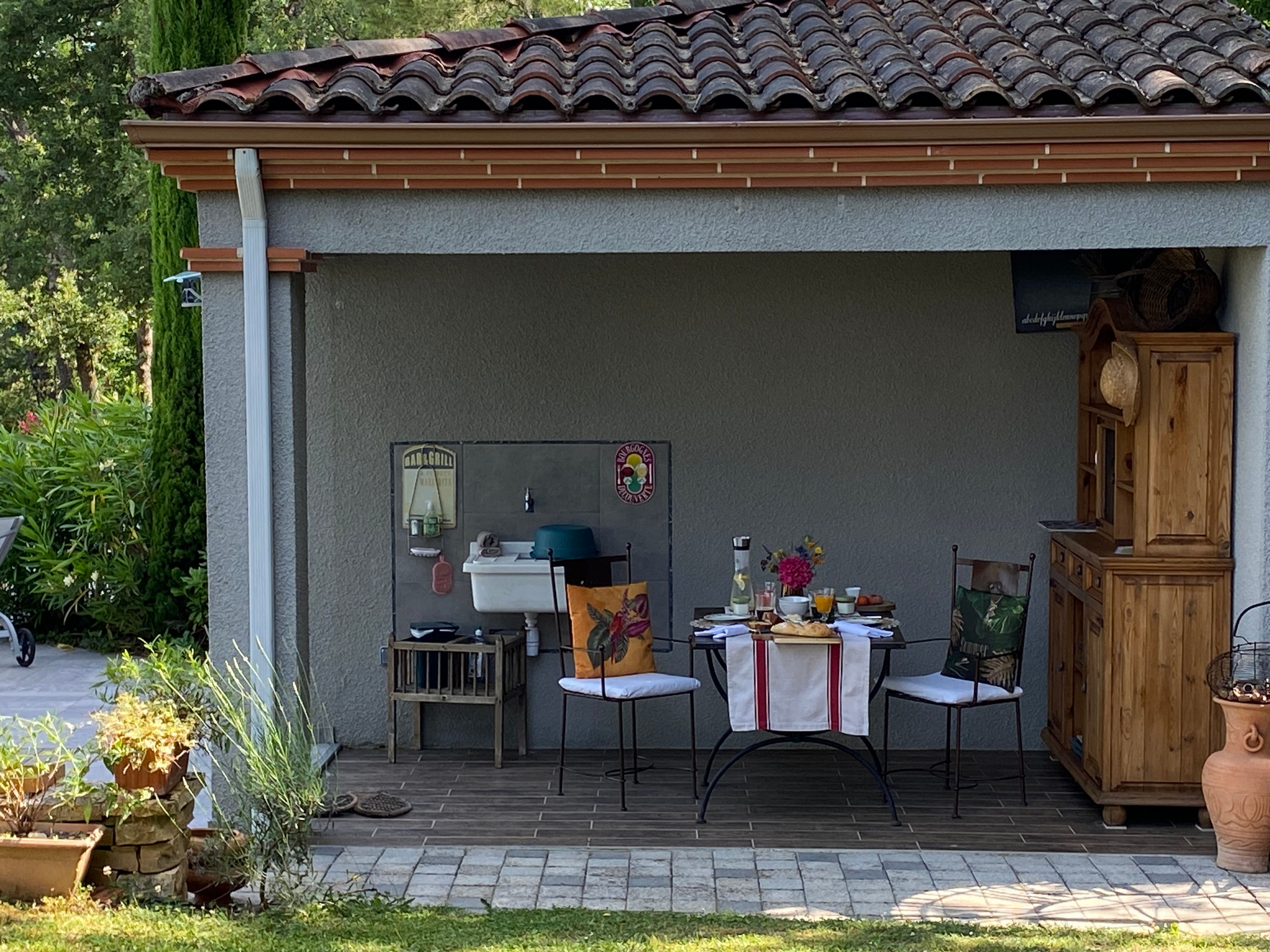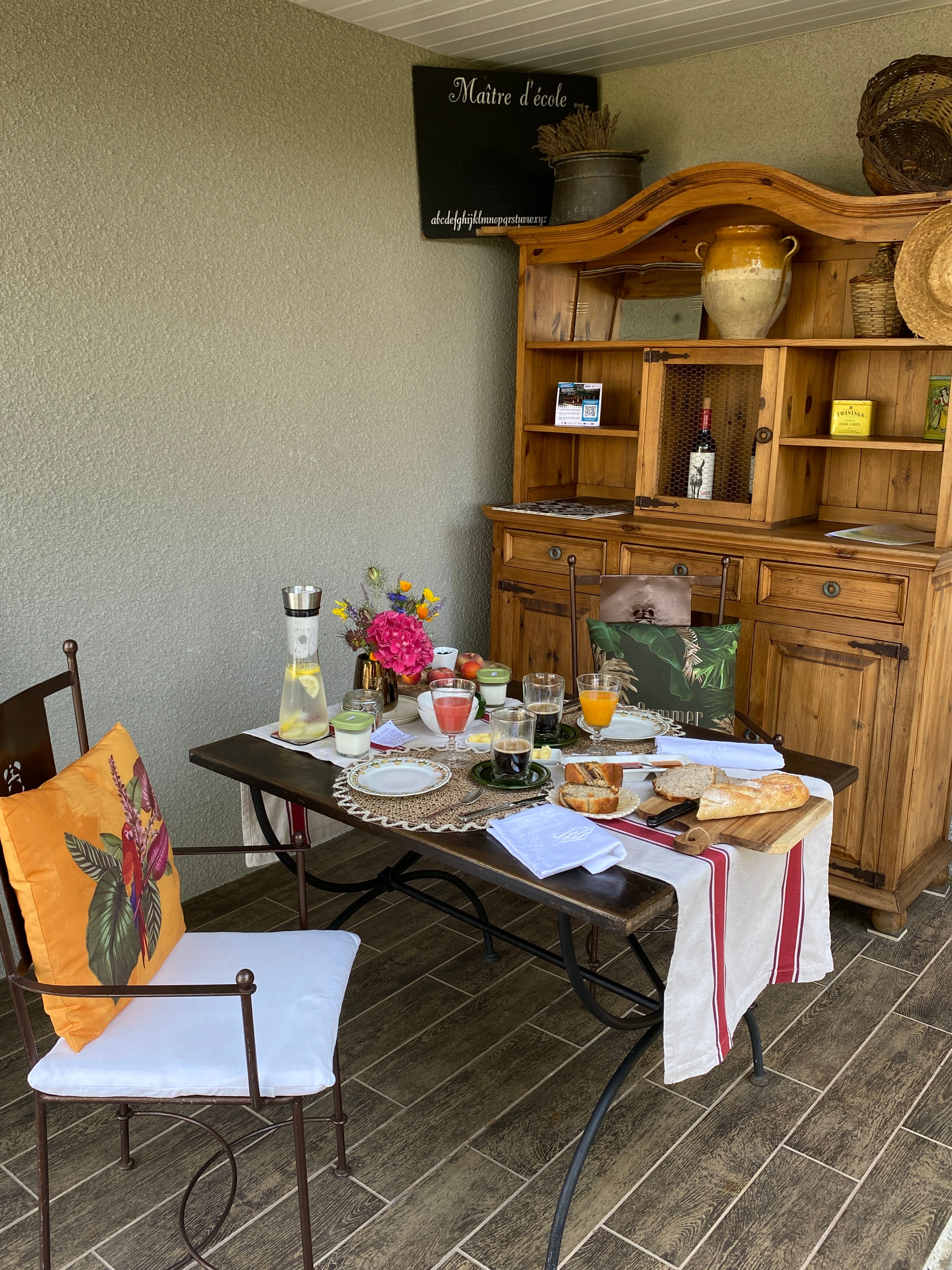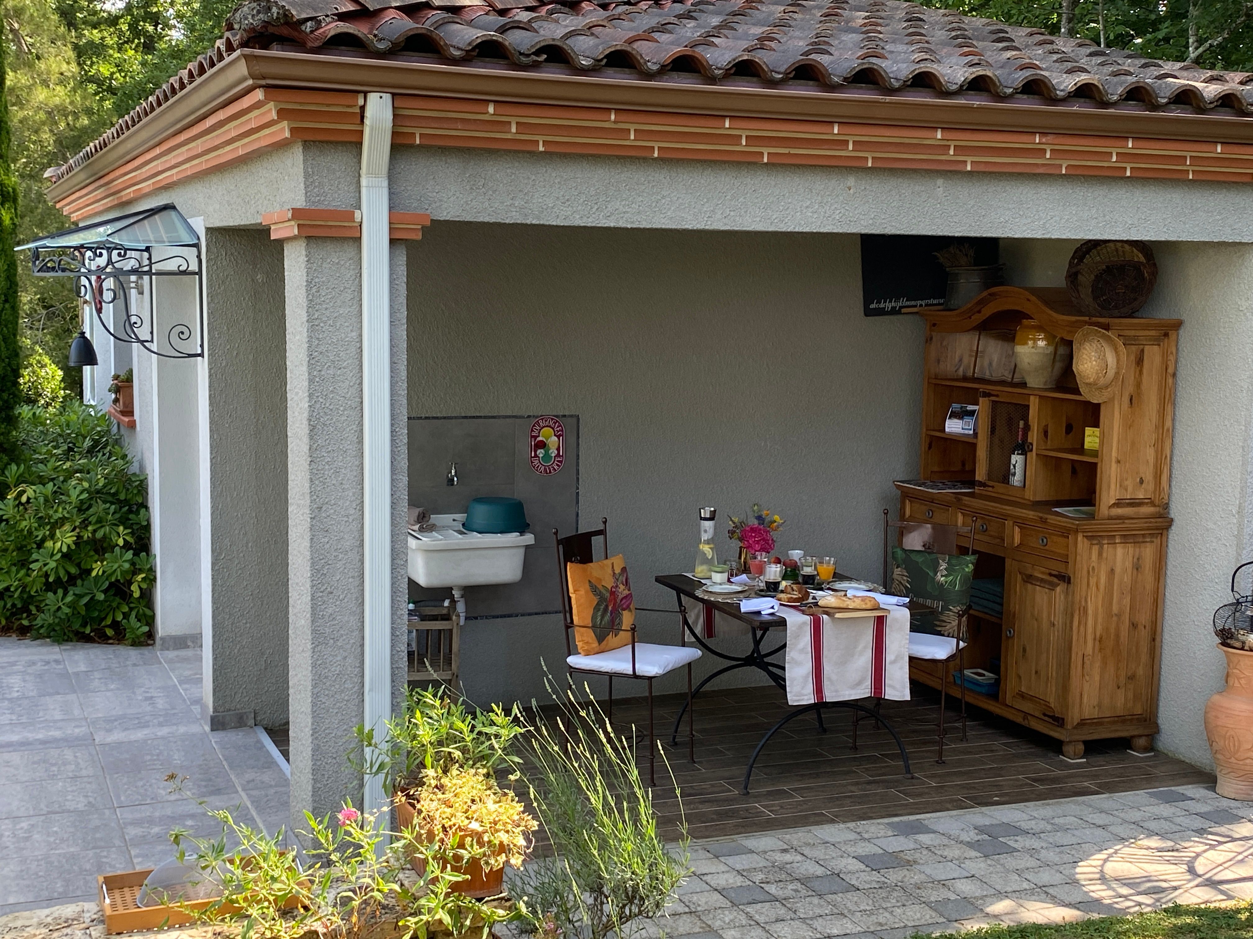 Dans une dépendance parfaitement aménagé la chambre d’hôtes vous attend avec 1 lit 160, une salle d’eau ouverte avec lavabo, douche (robinet thermostatique), wc séparés fermés. Fauteuils, plateau de courtoisie, télévision, wifi, climatisation. Espace extérieur protégé avec table chaises et le nécessaire pour pique-niquer (assiettes couverts verres) Tonnelle avec salon(…)
