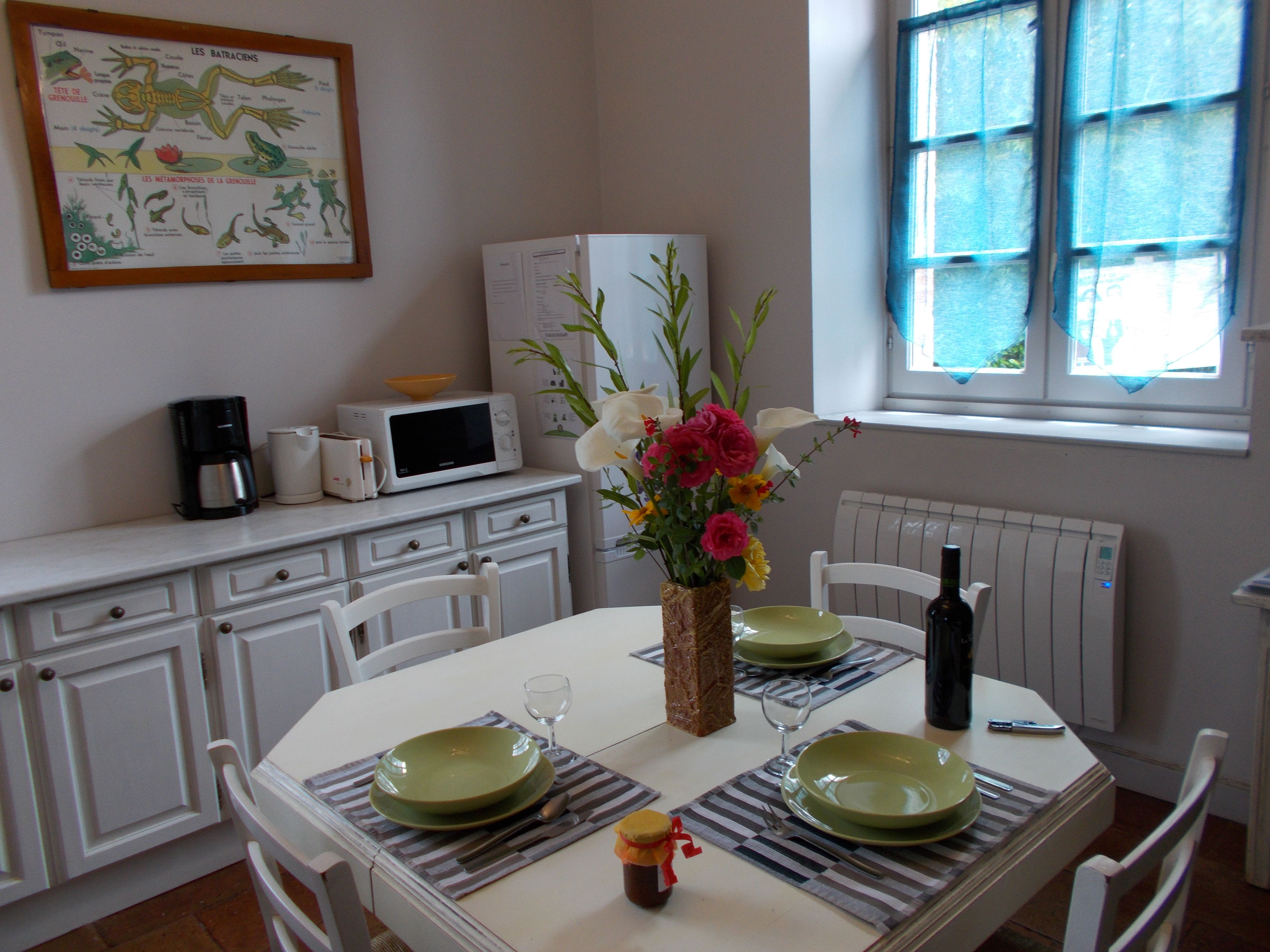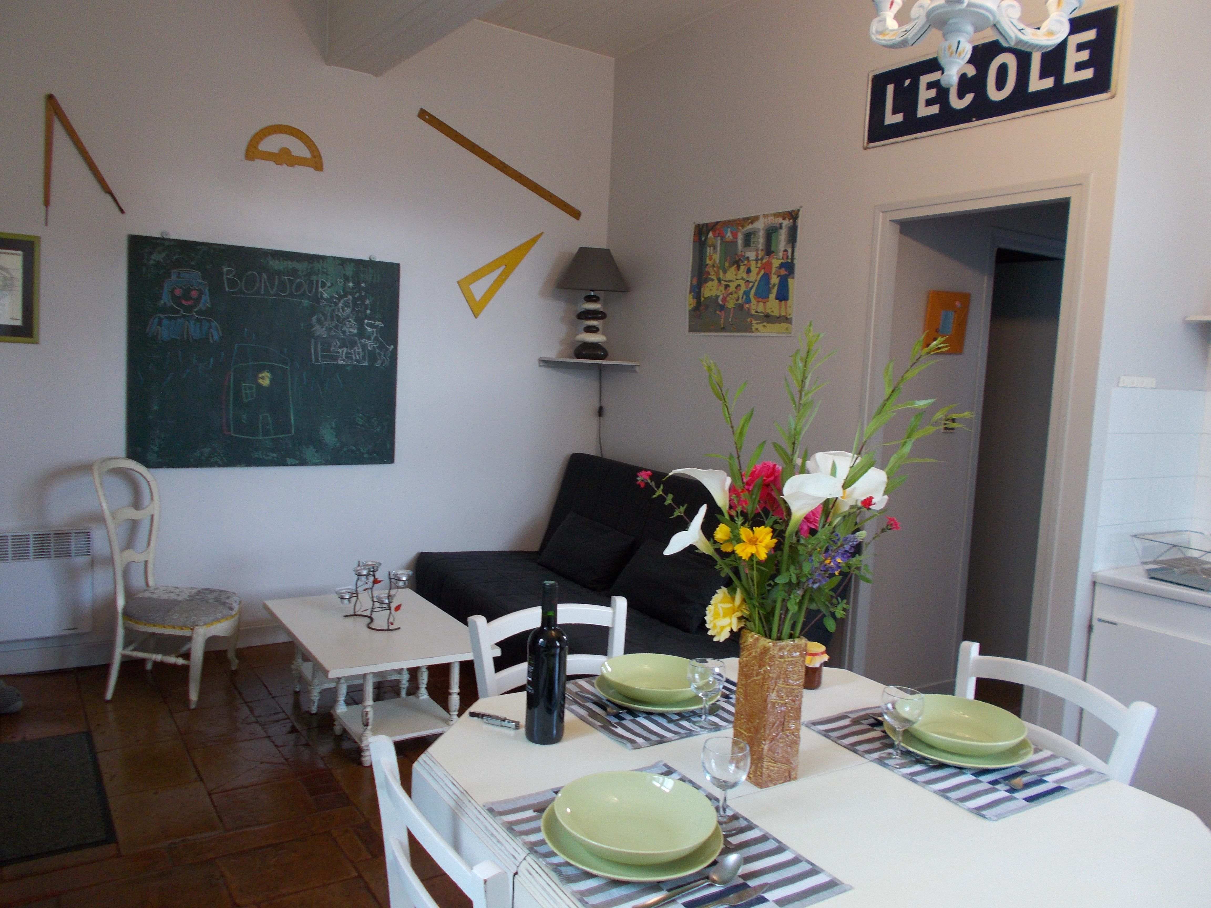Encontramos el tema de la escuela en un ambiente moderno, muebles pintados y color anís animan una decoración inventiva y amigable. Espacio exterior privado y vallado.