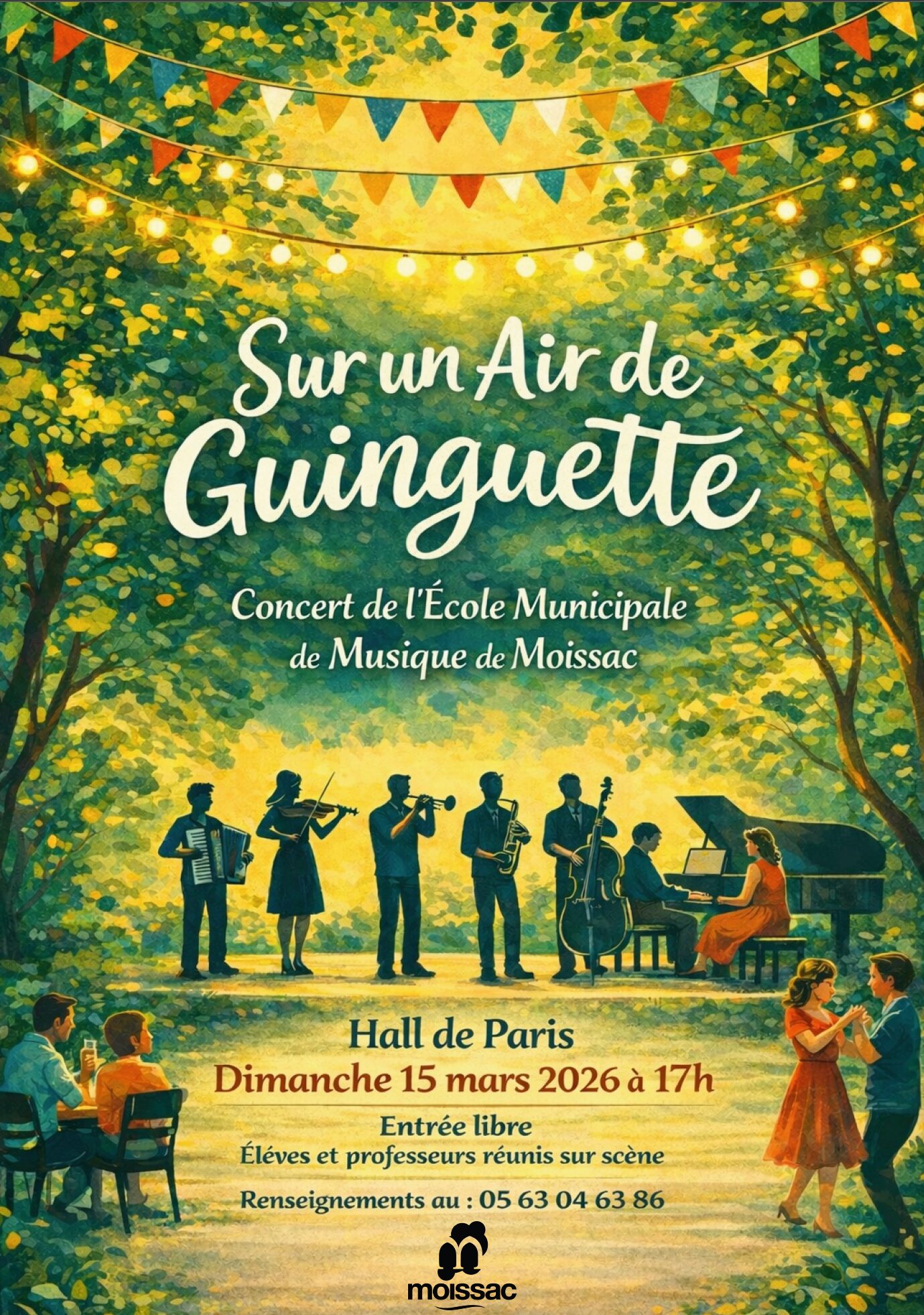 Sur un air de guinguette ! L’École Municipale de Musique de Moissac vous invite à son concert aux couleurs festives et printanières ! Élèves et professeurs réunis sur scène vous proposeront un moment musical convivial, inspiré de l’esprit guinguette.