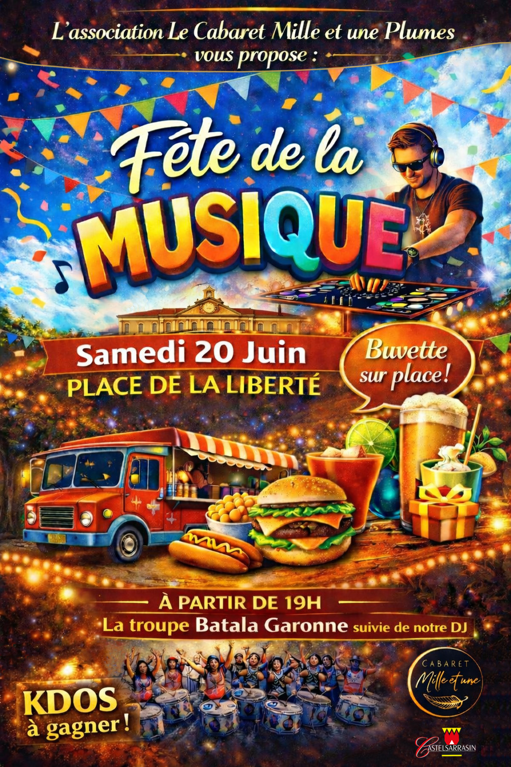 Fête de la musique organisée par l’association Le Cabaret Mille et Une Plumes de Castelsarrasin.Percussionnistes, suivis de notre DJ de Bec. De nombreux petits cadeaux sont à gagner !Food-truck et buvette sur place.