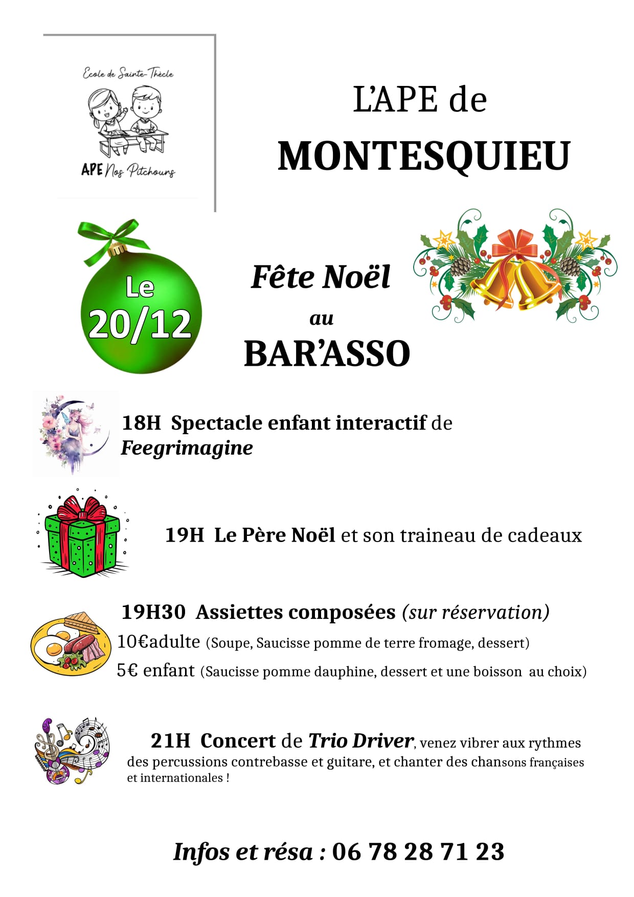L’APE de Montesquieu vous accueille au Bar’Asso à 18h pour un spectacle familial interactif magique et poétique présenté par Feegrimagine. A 19h, le Père Noël viendra nous rendre visite! Ensuite, une assiette composée est proposée. Et la soirée se clôture avec un concert de Trio Driver, musique entrainante et chantante!