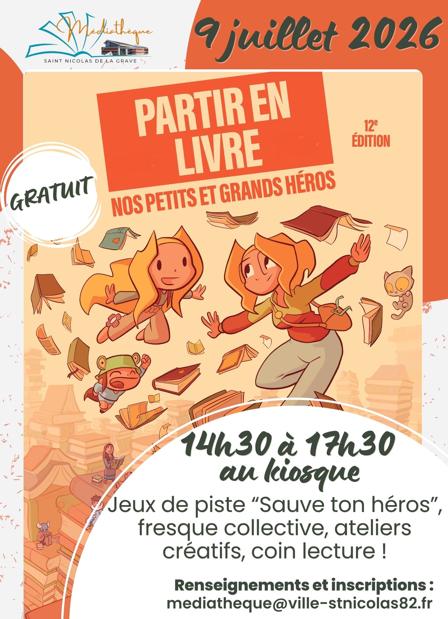 La médiathèque de St Nicolas de la Grave participe à la 12ème édition de Partir en Livre, le grand festival du livre pour la jeunesse, dont le thème cette année est « Nos petits & Grands héros ». Une belle programmation a été élaborée avec de nombreuses animations, des ateliers créatifs et ludiques qui aiguiseront la curiosité et l’imaginaire du jeune public. Jeu de piste, fresque collective, atelier créatif et coin lecture… (Animations sur inscription)