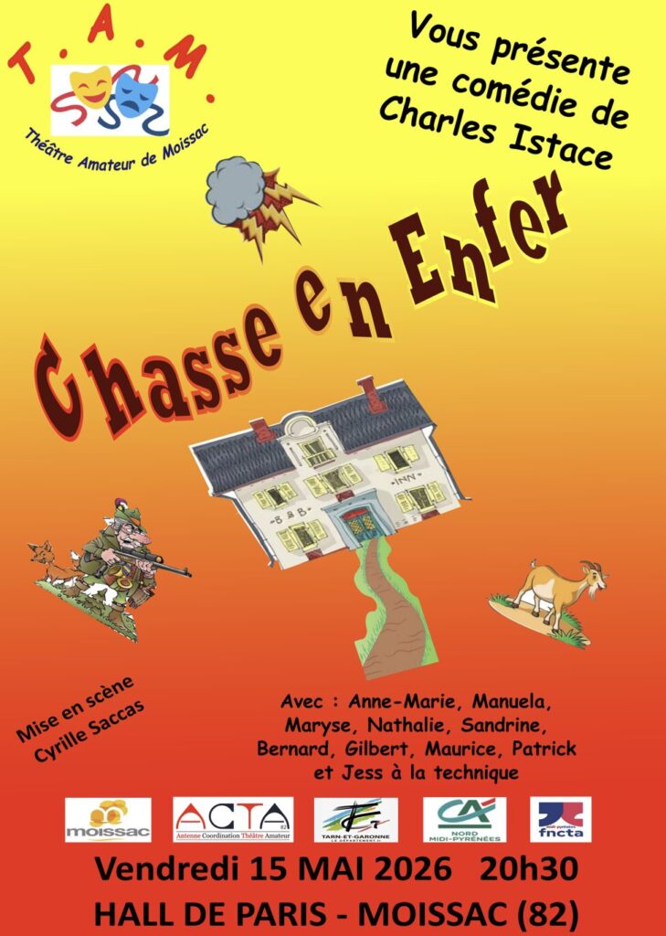 Le T.A.M. (Théâtre Amateur de Moissac) vous invite à une soirée pleine de rires !Venez découvrir Chasse en Enfer, une comédie de Charles Istace, mise en scène par Cyrille Saccas.