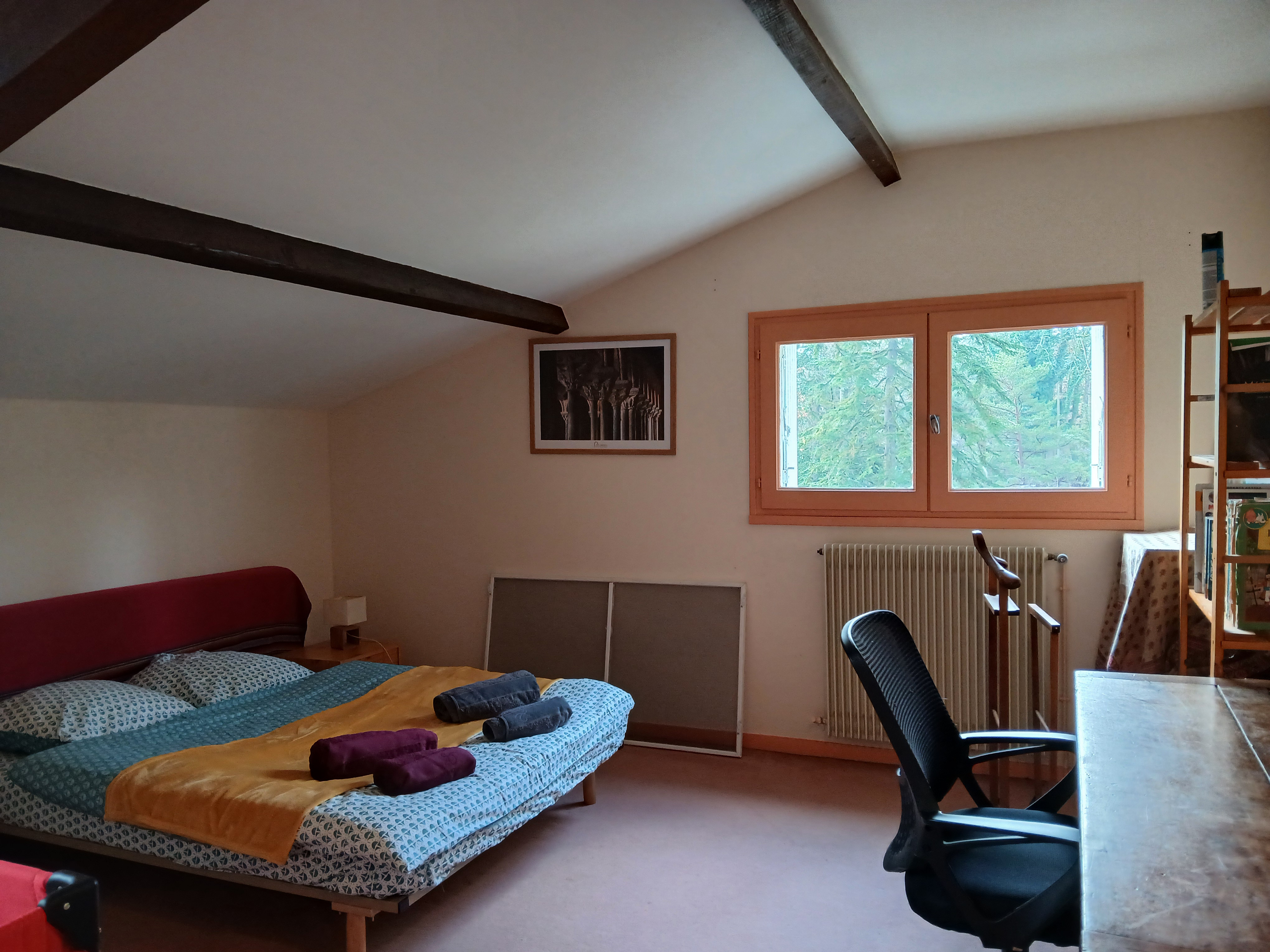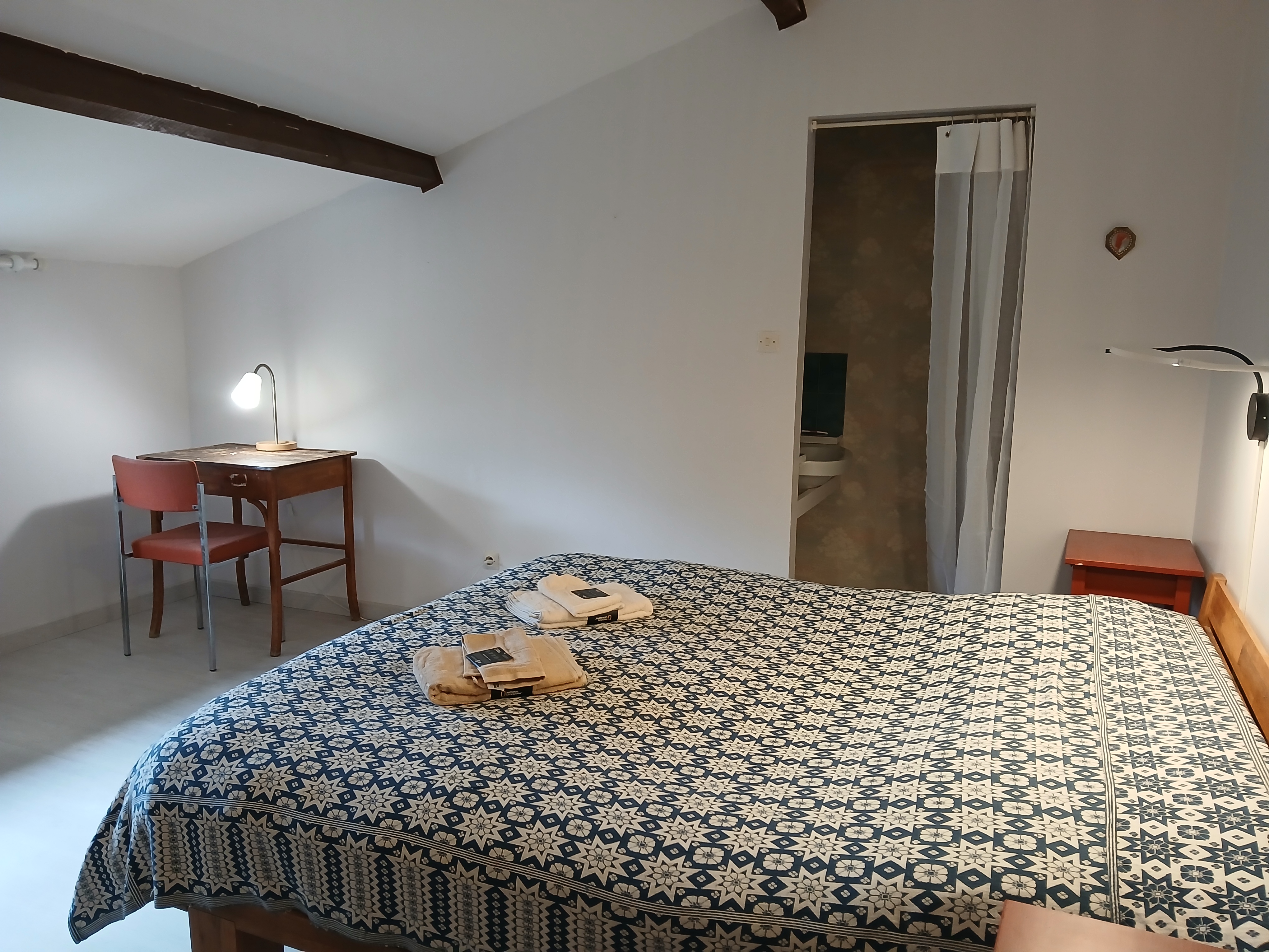 Située au 1er étage, la suite familiale se compose de trois chambres indépendantes avec 1 lit 140 chacune et un lavabo. Elle peut accueillir jusqu’à 5 personnes et dispose d’une salle d’eau commune, pratique et adaptée à une utilisation partagée.